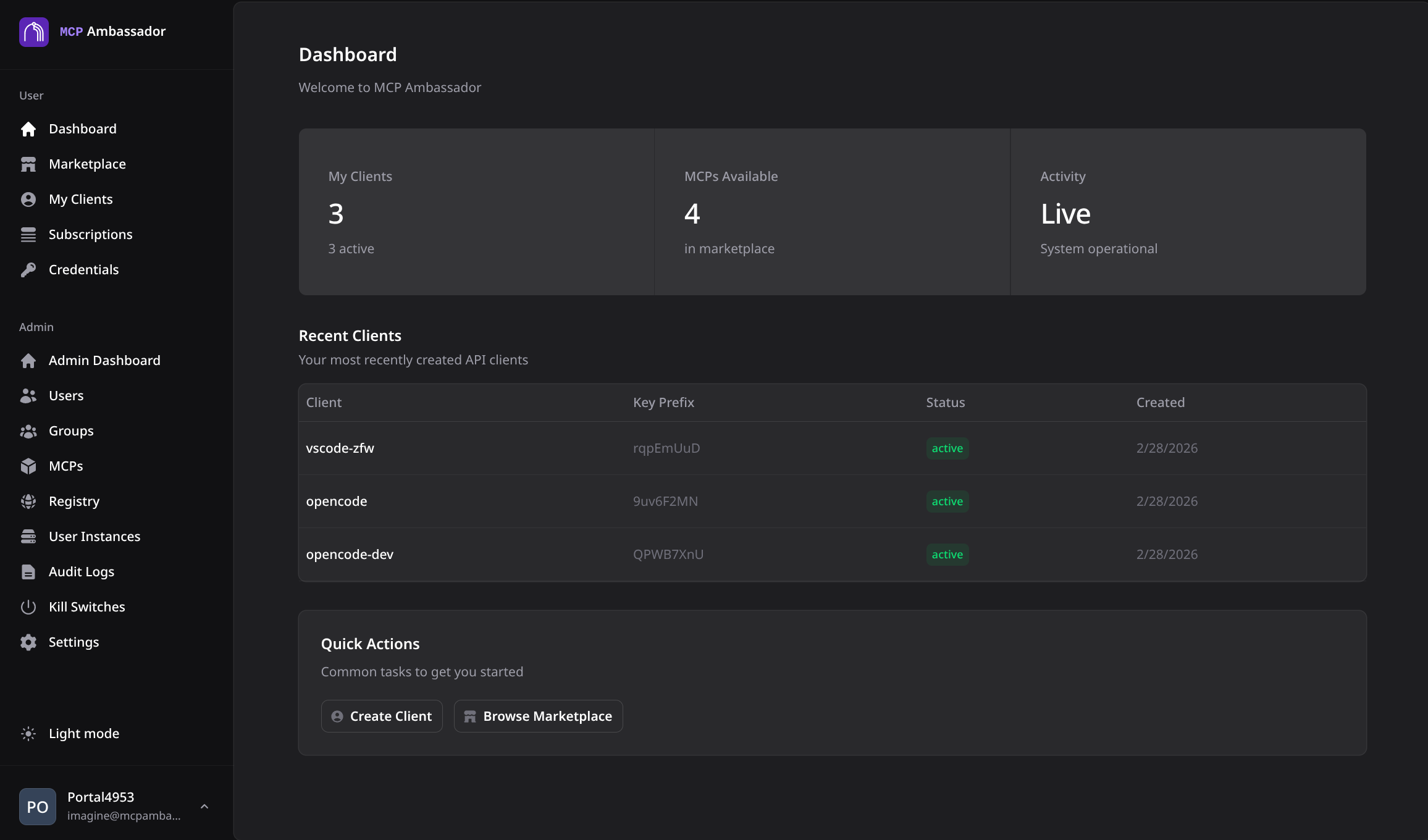 Full React 19 SPA for both admin and user workflows. MCP catalog management, group RBAC, marketplace, client management, and subscriptions. Dark mode, responsive, accessible.