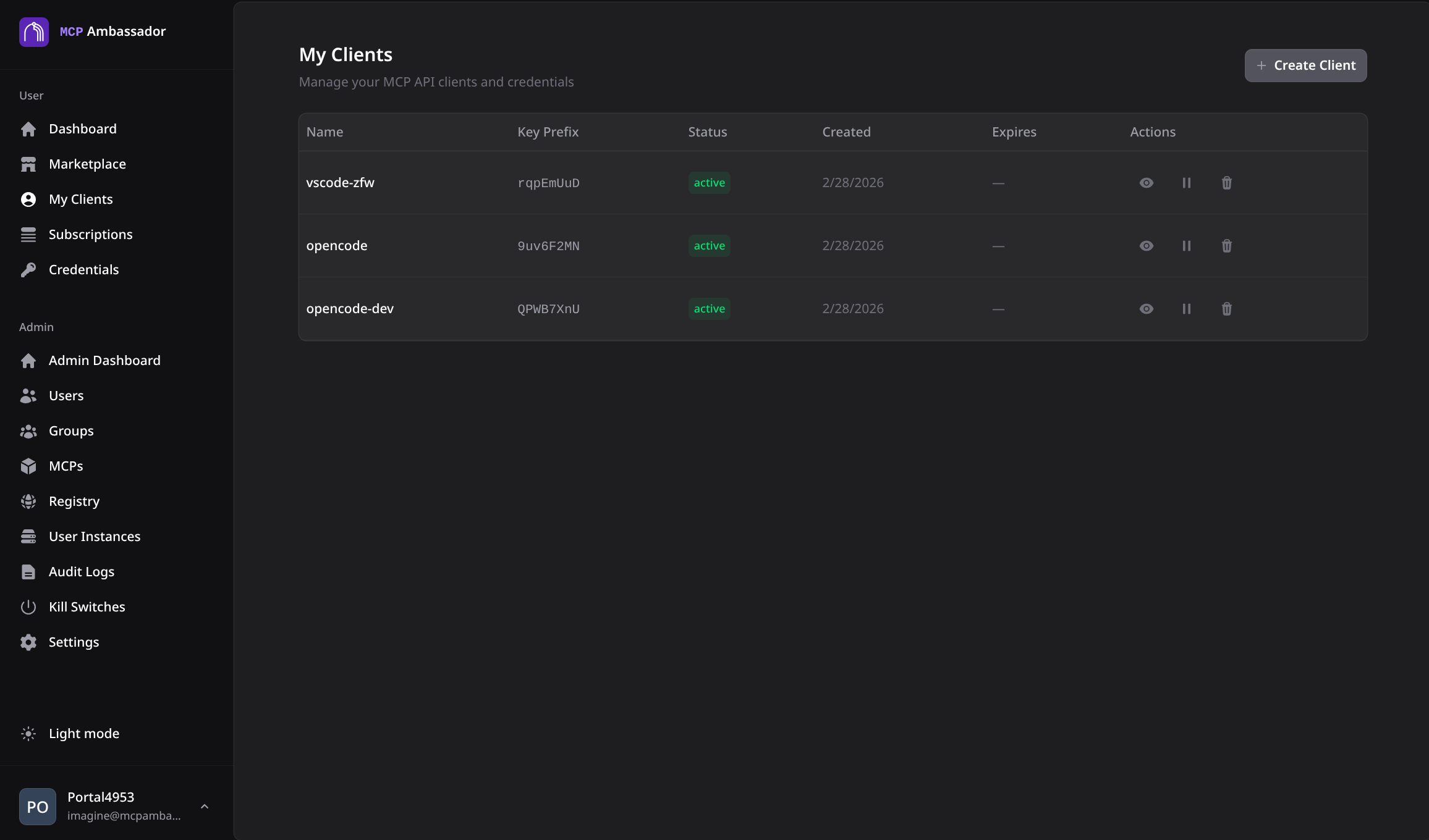 A client is a registered instance of the Ambassador Client — one per device or AI tool. One user can have many clients.