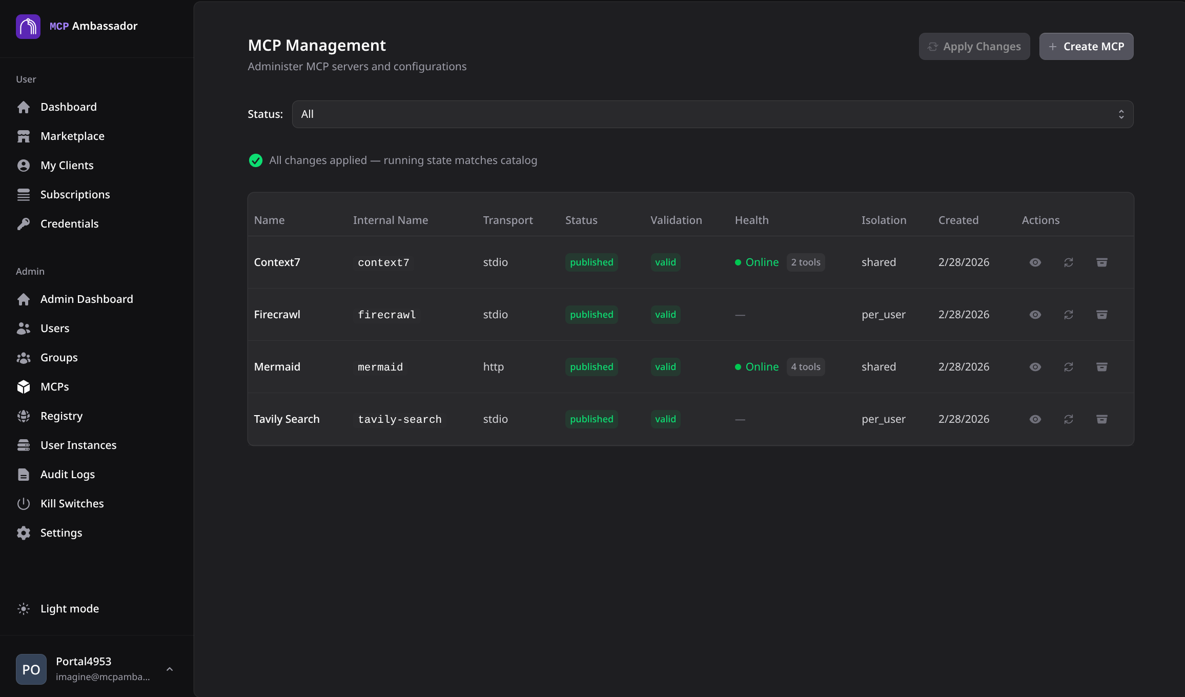 The MCP catalog is the admin-managed list of available MCPs on your Ambassador Server. Admins add MCPs, configure them, validate connectivity, and publish them to the marketplace for users.