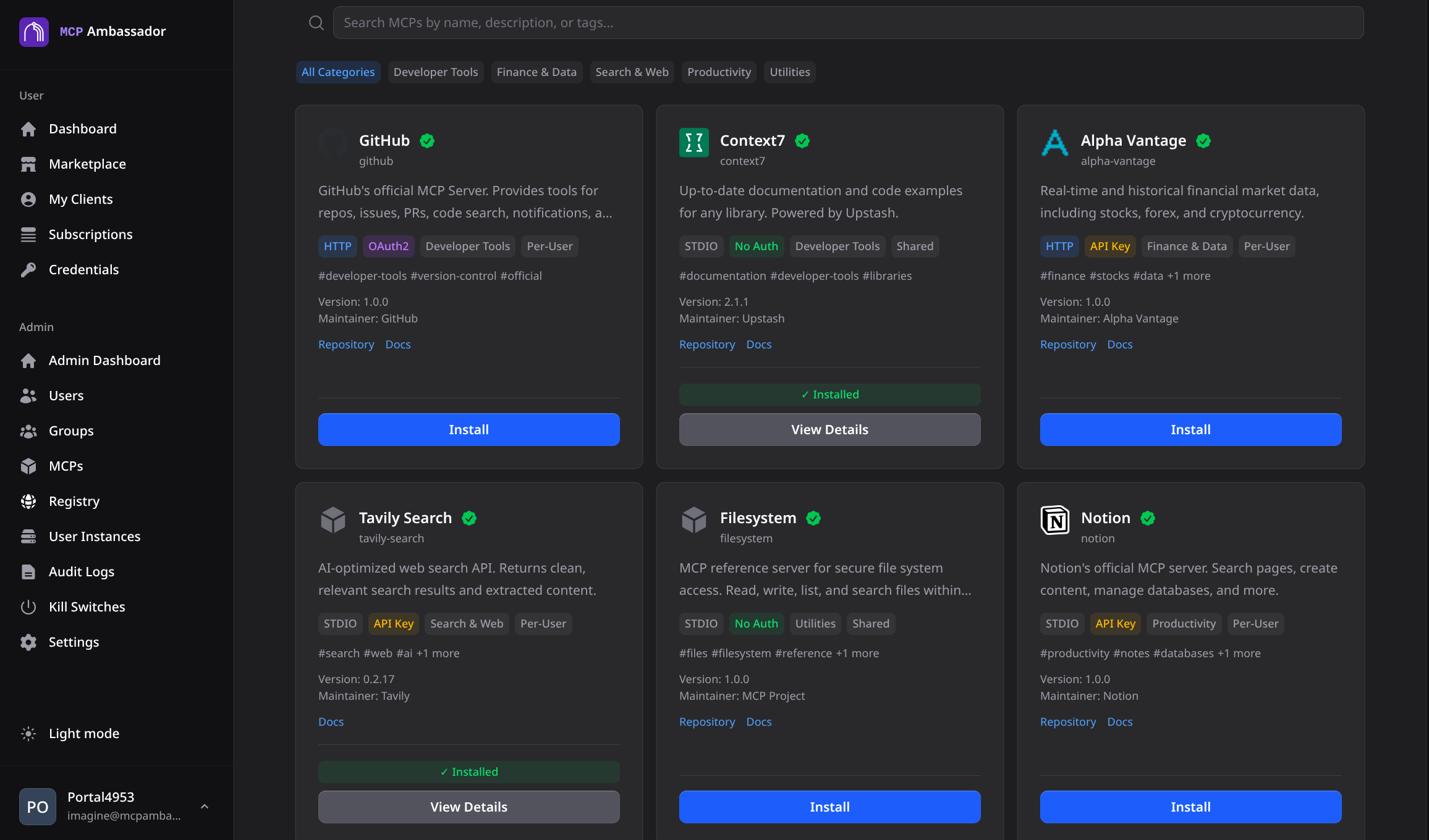 The MCP Ambassador community registry ships spawn commands, environment variable schemas, and tool metadata for 38+ popular MCP servers. Admins add them to the catalog in minutes — no writing spawn commands or figuring out environment variable names from scratch.